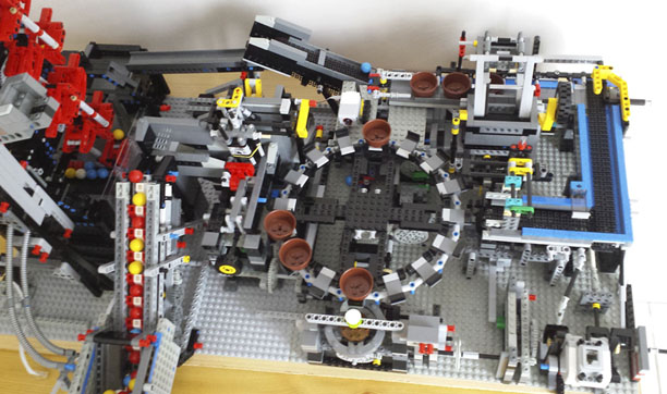 Johan49 Posted June 9, 2016 Posted June 9, 2016 (edited) Hi I intend to show the ball factory in october to some exposition in France I have made a lot of improvement so the system is now able to run several hours without jam or problems I have strengthened some part by putting vertical beams where appropriate. I also facilitate access to every mechanical part so as to facilitate the timing adjustment should it be needeed Mainly I made big changes in two modules 1) I replace the chain system by transferring the rotate movement to the back of the model and transform the rotation to linear movement with levers. Forget previous post due to error . I am riposting the whole thing Hi I intend to show the ball factory in october to some exposition in France I have made a lot of improvement so the system is now able to run several hours without jam or problems I have strengthened some part by putting vertical beams where appropriate. I also facilitate access to every mechanical part so as to facilitate the timing adjustment should it be needed Mainly I made big changes in two modules that where source of jamming and malfunctions 1) I replace the chain system by transferring the rotate movement to the back of the model and transform the rotation to linear movement with levers this way operations of the buckets are more controllable 2) I redesigned completely the ball picker so it operates smoothly. One key point was to change the gear ratio that move the picker. Another was to consolidate the head to improve gliding Here are some pics The module Edited June 9, 2016 by Johan49 Quote