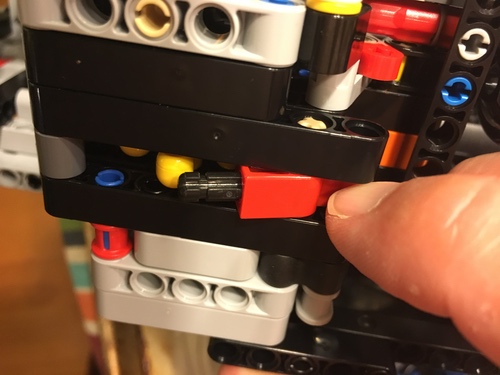 Pangolyn Posted July 4, 2016 Posted July 4, 2016 (edited) I wanted the gears to shift properly (90° with no flipping back a bit) but I wanted a solution I could apply without taking the model apart. I have a ton of axle 2 notched so I put one in each red thing: This works perfectly and can be applied without too much trouble. The inner one is a little harder to insert but it's doable with a creative use of another long axle and an axle connector. Continuing to build to verify it will work with the body added. Edited July 4, 2016 by Pangolyn Quote