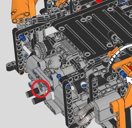 I3Brick Posted October 24, 2016 Posted October 24, 2016 (edited) I was wondering if anyone has a suggestion for the following: I want to motorise my model, but only require it to function when the wheels are off the ground. The point is to show off the gear shifting function by seeing the wheels turn slower or faster when shifting. Since having the car resting on its wheels adds too much weight (requiring big motors and potentially running into issues with the drive train/wear and tear), and since I don't want to have a fully RC model, this should be less complicated than a fully RC model. I don't mind if the motor is external to the car. The most convenient spot I found so far to do this is at the back. My plan is to extend the axle marked in red on the picture (passing through the lowest of the two grey gears used to make the engine turn) with one stud. That way I can connect an axle connector with L-motor to it when I want to show the functionality, and I can easily remove (and hide) the motor when the car is on display. That would mean I'd have to split up the long black 15 stud beam of the rear bumper from step 597 into two smaller beams, so that the axle could pass through. Not sure what the overal impact will be on the sturdiness of the rear bumper if I do that, it seems to be a rather structural element. Any suggestions for the 'connection point' of the car and the motor? I am hoping that with the car off its wheels, a single L-motor will suffice to operate the entire drive train without causing too much wear and tear to all the gears. I'm not going to be running the car like that for long periods of time, but there's still a lot of gears involved. Thoughts and tips are welcome. PS: I did see the video posted by schraubedrin on page 13 of this thread. It looks like one of the easiest ways to connect an L-motor, but it connects to the rear wheels directly, meaning that you will only see the speed differences of shifting in the engine pistons. Those are hard to see, less spectacular and you can only apply this when the chassis is removed. I'd prefer a method that works with the chassis on as well. PSS: I also know stevenhalim tried connecting an L-motor and it worked with wheels off the ground (allbeit with Didumos69's mods, which I haven't all implemented), but I've got no idea where exactly he hooked up the motor and if anybody else tried doing this. Edited October 24, 2016 by I3Brick Quote
