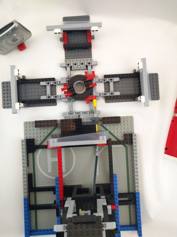 BusterHaus Posted March 24, 2017 Author Posted March 24, 2017 I built a platform taking pictures used in stop motion animation. Some features: Platform can rotate Camera can tilt Camera is mounted on a quick-mount bracket to make battery changes much easier. This required the drilling of two plates. The table is rotated as follows: 8 tooth gear is connected to a manually operated lever 8 tooth gear drives 24 tooth gear 24 tooth gear has a 2L worm gear on the same axle 2L worm gear drives the old-style large turntable The result is a very slowly moving table which is helps cover differences in the rotation angle. The platform is made of two layers of panels stacked together. It's very rigid and is covered with white paper. The platform is supported by 4 beams, which makes it more stable than wheels, but increases friction during rotation. To reduce the friction, I added clear tape (Scotch Tape) on top of the support beams. I also pulled or pushed the platform gently as it was rotated, to make sure that it was always at the end of the physical travel. The camera tilt is controlled through two small linear actuators. Play in the tilt mechanism is eliminated with red rubber bands. There is also a position lock on the other side of the adjustment shaft. The result is this: Quote