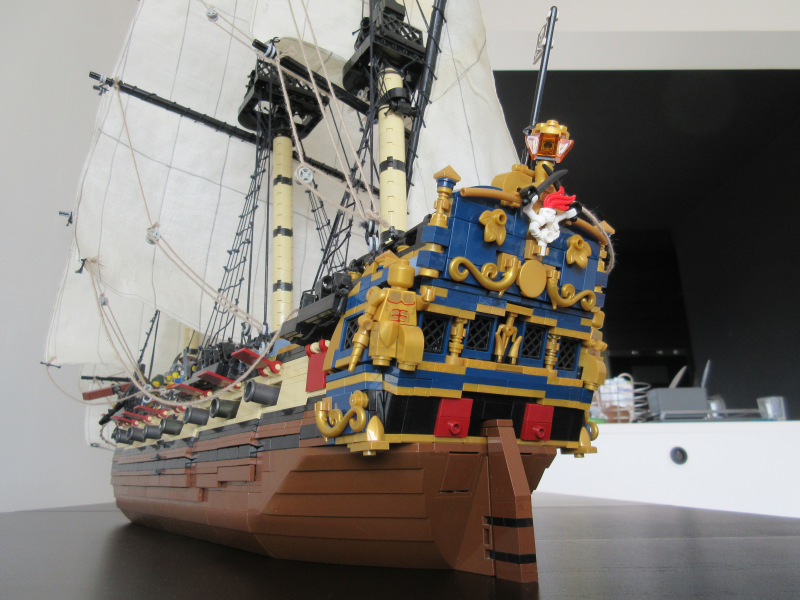 Sebeus I Posted May 4, 2024 Posted May 4, 2024 I made some last-minute changes on the stern before putting it on display at the local library. I swapped the windows by pearl gold lattice ones, complementing the ornaments. I gave each of the idols a trident as well and removed the skull I had on it earlier. I decided I didn't quite like the white on there. I have been considering to re-rig the ship Quote