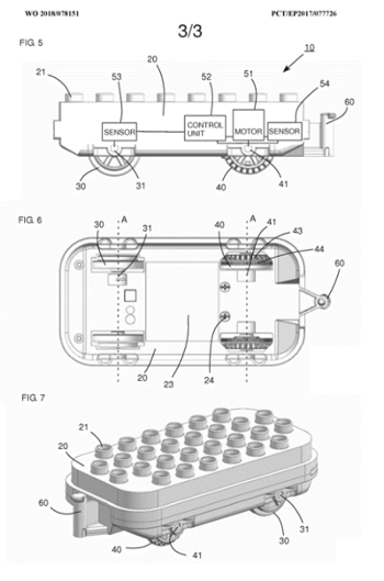rzido Posted January 30, 2019 Posted January 30, 2019 On 9/2/2018 at 4:40 AM, Mr Hobbles said: 4. There is a speedometer on the front wheels! The front wheels are completely free wheeling, but the speedometer also reports the speed that they're going at. Interestingly, if there's no movement on the front wheels, the motored wheels don't go, no matter what commands you give it. So if you tell it to go at speed 100 while holding it in your hands, it will turn on for a second or so, but then turn off again, as the front wheels aren't rotating. It remembers though - if you manually spin the front wheels, it will start moving again. The "Push & Go" patent explains this behaviour. Summarizing it: the base has two axles of wheels, in which the front axle is passive (the wheels follow the movement of the locomotive) and the rear is active (it is motorized). There are two motion detection units. A motion detection unit/sensor is located on the front axle, which detects the movement based on the rotation of the wheels / front axle. The base has a microcontroller unit that detects the signal of the movement sensor of the front axle and based on it activates an electric motor connected to the rear axle that rotates the wheels of this axle continuously. In addition, the locomotive has a second movement sensor connected to the rear axle and capable of detecting a deceleration or a blocking force applied to the movement of the rear axle wheels. If detected, the control unit for the engine and the locomotive stops.The motion detection unit may also detect the rotation speed of the first axis; and based on this, the electric motor starts at a speed that adapts to the speed of rotation detected. It can also detect the direction of rotation of the wheels, applying the driving force to the rear axle in the same direction as the detected rotation. The movement of the front wheels through an action of the Push & Go type activates the operation of the engine, which in turn drives the rear wheels. If you are curious, there are another patents that could be interesting : WO2016177823 (A1) ELECTRICAL CONNECTOR AND CONNECTOR ELEMENTS FOR A MODULAR CONSTRUCTION ELEMENT AND/OR SYSTEM WO2016037977 (A1) A METHOD FOR ESTABLISHING A WIRELESS CONNECTION BETWEEN ELECTRONIC DEVICES WO2017037301 (A1) A TOY CONSTRUCTION SYSTEM COMPRISING A REMOTE CONTROL DEVICE WO2017037302 (A1) A REMOTE CONTROL DEVICE WO2018158357 (A2) AN INTERACTIVE MODULAR CONSTRUCTION ELEMENT AND A MODULAR CONSTRUCTION SYSTEM WITH INTERACTIVE MODULAR CONSTRUCTION ELEMENTS WO2016037978 (A1) A METHOD FOR ESTABLISHING A FUNCTIONAL RELATIONSHIP BETWEEN INPUT AND OUTPUT FUNCTIONS WO2015173246 (A1) A TOY CONSTRUCTION SYSTEM WITH FUNCTION CONSTRUCTION ELEMENTS WO2016124584 (A2) TOY SYSTEM COMPRISING TOY ELEMENTS THAT ARE DETECTABLE BY A COMPUTING DEVICE WO2016062671 (A1) A TOY CONSTRUCTION SYSTEM AND A METHOD FOR A SPATIAL STRUCTURE TO BE DETECTED BY AN ELECTRONIC DEVICE COMPRISING A TOUCH SCREEN Quote