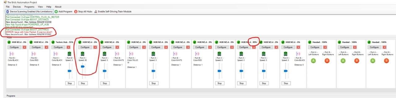 Wimee Posted January 25, 2020 Posted January 25, 2020 I just started with the BAP software v1.5 (great job, awesome software!). I bought a few Powered UP XL motors (bb0960c01), Hubs (bb0892c01), Technic Hubs and Color & Distance Sensor 88007.I was able to connect up to 16 devices to my internal Bluetooth device (Qualcomm Atheros QCA61x4) of my DELL desktop. When a PUP XL motor is connected to HUB NO.4 the motor is not running when I move the speed slider ( with technic hub no problem). Sometimes also an error message pops up during connection of the hub with sensor: "ERROR: Issue with color packet. It was too short!!". Most of the times the battery level of HUB NO. 4 shows 0%, with Technic Hub it's ok (maybe firmware issue with HUB NO.4?). Thanks again for the great software! Quote