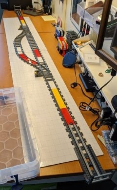 Walt White Posted March 3, 2020 Posted March 3, 2020 @AlecDGeneric -- thanks for the details. Other builder's experiences is exactly what I need to help me troubleshoot this situation. It sounds like we are both using the same basic approach, now that I'm trying to use one big program loop for both trains instead of using separate code segments for each train. Your physical layout sounds very close to mine and we are both using sensors on the trains, not next to segments of the track like many others seem to be using. Using sensors next to the track would require three hubs (one at each endpoint and one at at the bypass segments) in addition to the hubs on each train. We are trying to do this all with two hubs - one on each train. I'm using the same color (red) at each end and at each bypass segment, and keeping track of location in the C# code by cycling through a known pattern of the four locations in a known order. You described "a substantial lag between the train going over the tiles and reacting to it, sometimes up to a full track length". For the same reason, I've had to run the train at 35% as the "fast" speed because setting the speed to zero doesn't stop the train. It coasts for quite some time. It's not like the EV3 motors that have a "brake" mode to really stop when you tell it to stop. I've attached a picture of my test track. Other things I have noted, some of which are specific to my project, some of which might help other builders: BAP version 1.5 lists three recommended colors for the 88007 color sensor: red, white, and yellow. No other colors or lack of color can be reliably read at this time. I haven't tried reading the logs that other builders mention, and my test track is put away for a few days, but I will start looking at the logs when I resume work on this. Another interesting feature of the 88007 color sensor is that once it reads one of the three recommended colors, it will continue to report that color until it sees one of the other two recommended colors. So I have white tiles at the transition to "open track". Adjacent red and white tiles will trigger a YELLOW reading from the sensor when directly over the transition, especially if the train is moving slow. I'm now counting consecutive readings and only acting on a color if it is read four or more times in a row. I have the same condition with my Mindstorms EV3 train and EV3 color sensor. The sensor reads my desktop (imitation wood grain) testing area as YELLOW when it's reading the open track, so I'm using white panels under the track. At the convention, there will be dark tablecloth under all the track. My Great Ball Contraption (GBC) endpoints require a relatively slow train when loading and unloading at the endpoints, so as the train approaches either endpoint I use yellow to trigger "slow down", then red to trigger stop and reverse in slow speed. As the train sees the yellow segment while leaving the endpoints, the code tells the train to speed up. At one of the endpoints the train needs to wait two seconds for the GBC ball loading process. I'm not giving up yet. Hopefully by the end of this week I'll get time to try a single large program loop to make this project work. Quote
