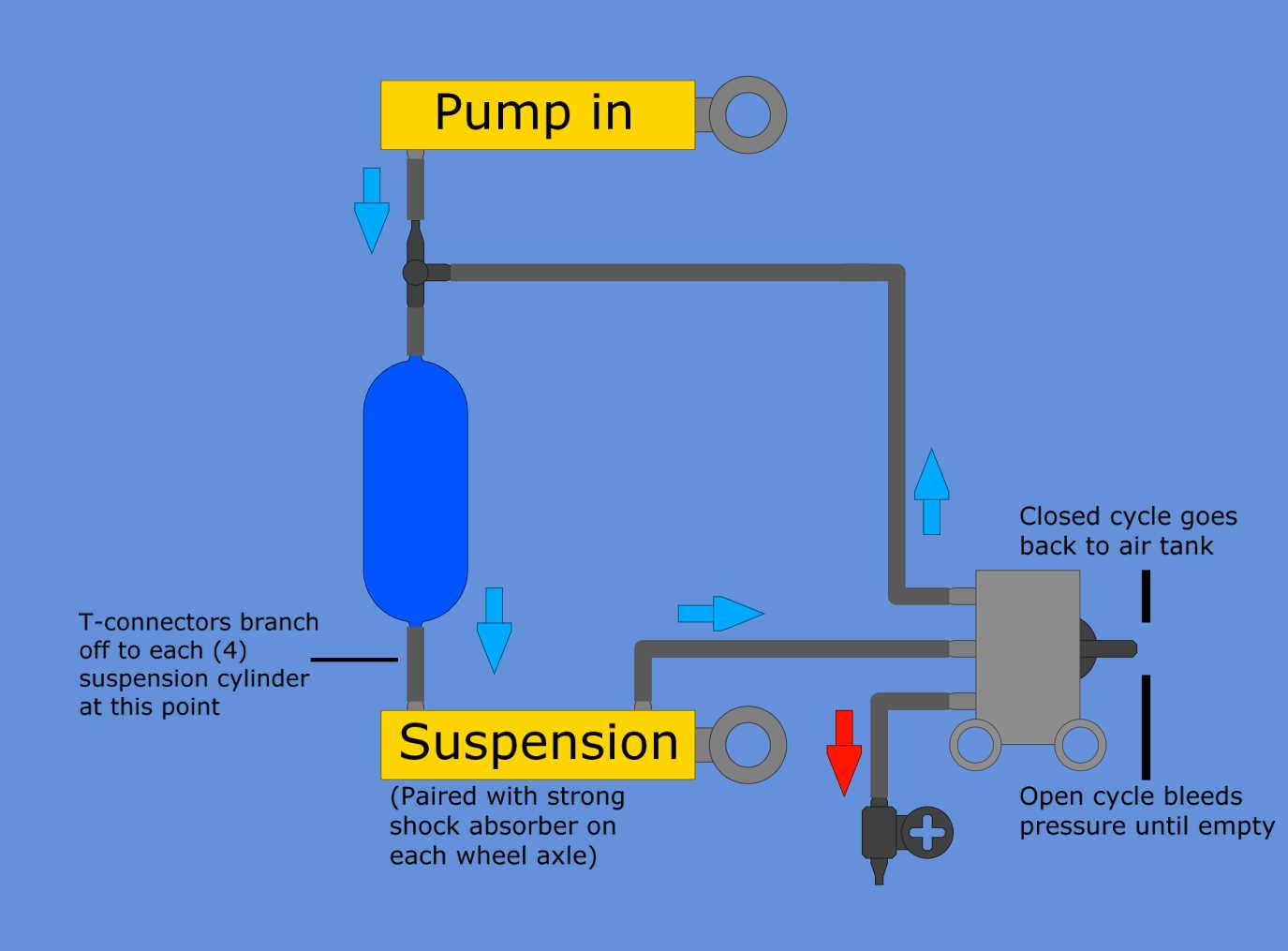 Flecktyphus Posted February 8, 2020 Posted February 8, 2020 (edited) Stupid question (from someone who's been out of the game for 10 years) - would replacing one shock absorber on each axle with a pneumatic cylinder allow easy switching between maximum ground clearance, and "weak" suspension? Or would you simply be stuck with either max clearance/minimum clearance? As in - Pump for increasing pressure, tank if necessary, then T-splits and hoses going to each pneumatic cylinder. The output connectors then connect again and go to a switch, where air can be either let out, or just flow through the hoses. So to be clear (missed in my drawing) - the hoses split off after the tank, going into one cylinder each, then reconnect after their respective cylinders, to go through the switch. Would it work or is there some obvious mistake here? :-) Notice this is all manual, just for (potentially) being able to adjust ride height and stiffness of the suspension. Edited February 8, 2020 by Flecktyphus Quote