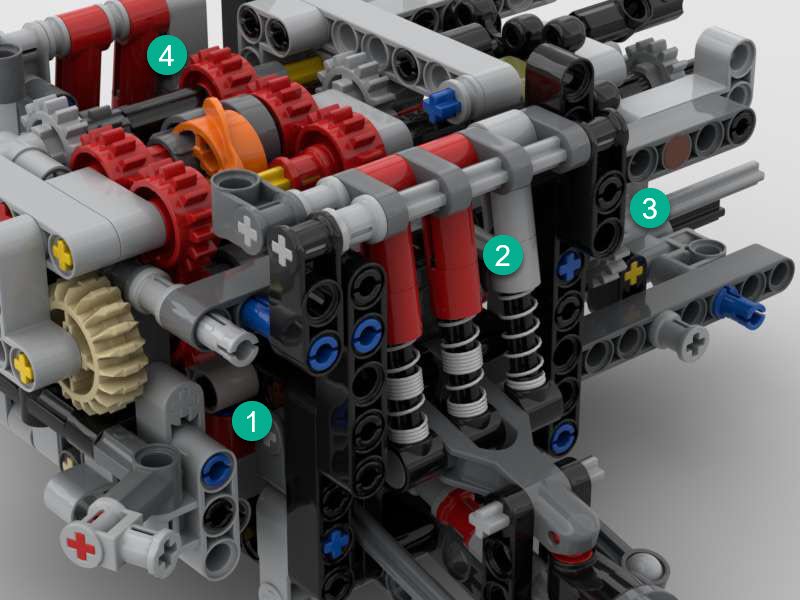 Some Belgian LEGO Fan Posted April 27, 2020 Posted April 27, 2020 (edited) I made the bodywork easy to remove (without following the mod guide). I wanted the seats to stay on the chassis, and not in the bodywork. There are 10 pins connecting the bodywork to the chassis (indicated in red). I added a 'door stop' to prevent the trunk from opening inwards (indicated in green), and reinforced the connection between the front arches and the doorstep. Two half-height 5L beams click into the 5x7 frames I used to reinforce the front part of the chassis. The rear seats still fold, but less far if the bodywork is mounted because of the B-pillars. For motorisation, I removed the whole gearbox and made a low-high gear and lockable center diff in the center console. The center console still needs to be finished. For the steering, my final idea was to put the servo motor where the cranck shaft was. It works and drives really well, even faster than I expected. The steering wheel is still turning and the front suspension can handle the weight of the servo without modification. The rear suspension is now oriented straith up instead of slightly inwards, to make room for the battery pack. This also makes it a little firmer which is good for the added weight. I hope to finish the center console soon... Edited August 28, 2020 by Some Belgian LEGO Fan Typos Quote