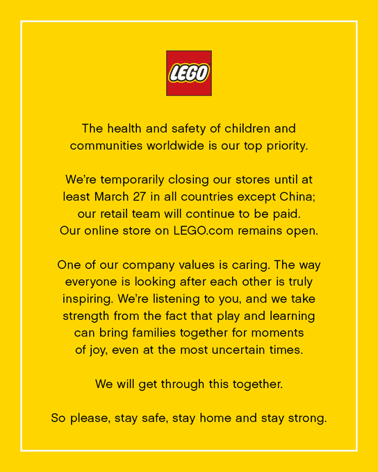 TeriXeri Posted March 18, 2020 Posted March 18, 2020 (edited) LEGO Brand Stores close following COVID-19 - Brickset https://brickset.com/article/49365/lego-brand-stores-close-following-covid-19 Also Twitter @LEGO_Group : Edited March 18, 2020 by TeriXeri Quote
