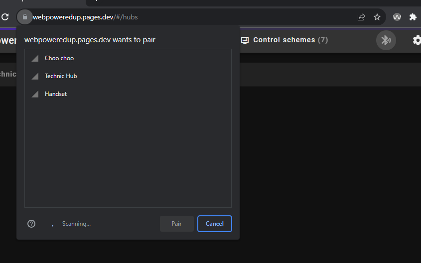 nvsukhanov Posted September 14, 2023 Author Posted September 14, 2023 (edited) On 9/14/2023 at 7:42 AM, Lok24 said: I think no, it's completely different. With Pybricks you do programming, program resides in the hub No External device needed while controlling WebPoweredUp "only" translates commands while controlling the model. And you configure what actions (press button) result in action (run motor A) Device with browser needed while controlling Expand @Lok24 , you are absolutely correct! Quote But how to "connect" a hub and the remote? Expand Thanks for your feedback! Guess I should've composed a manual (and I will definitely do). In a meantime, that one small button on the toolbar should initiate device discovery process (see attached pictures). Just importing control scheme won't help because control scheme bindings are "bound" to hub by it's unique id. After importing you can replace "bounded" hub with the hub that you have discovered&connected, but that will require such hub. Anyway, here's a sample control scheme import string, just in case: 0:3YCAgIJfgYCAgICAgIC9CArit6jM4OQ6Z8Ygr0y3Bq3N/aZxhB/CiFEE1mBrLiOP3j5fzMhDimX9p8D8GGlnMUoMf5V3N9Pu6V7Zxj0zPmPowOo9uGtfHhnoEmH3sUbr2zy05pAcDKgT0wV2Vk/+yPZS3KolkL3xPqJdNPXQtJj3cnNUNjVz7dHOQWZ0mrszG4aVkLctDVj7TzEZrb8egpideEWYIrVc5eJyFXOymY7JwoRX5K5OdeC/U5Mkf6xQ7hwjFvezBoIyQLZVOnFyRMlRRaEXut+X+SCtY8PtEDiRwVzEkwHN6yeebtd0Gyuq3fr8EbO1K7Vkf38k9uaA Edited September 14, 2023 by nvsukhanov added second picture with hubs list Quote