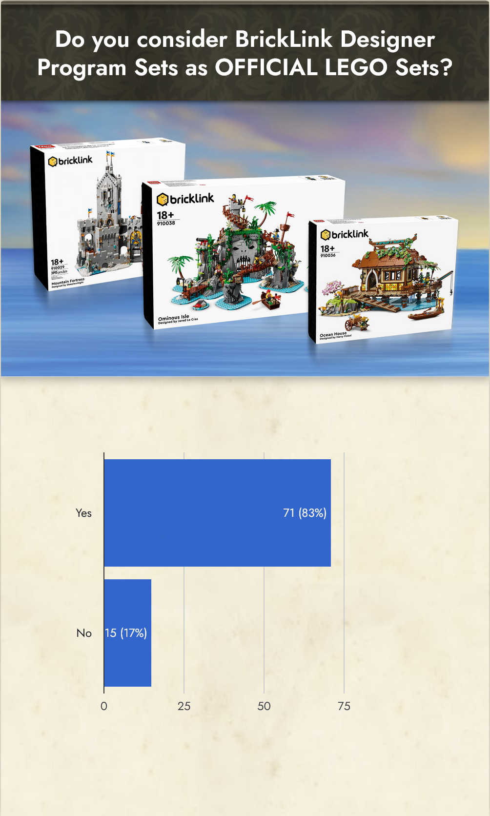 Governor Mister Phes Posted July 4 Author Governor Posted July 4 46 minutes ago, Yperio_Bricks said: I don't think a poll on a Lego fan site is representative of the general population The general population probably doesn't have a clue what the BrickLink Designer Program is. But how would you go about obtaining a larger sample size? Quote