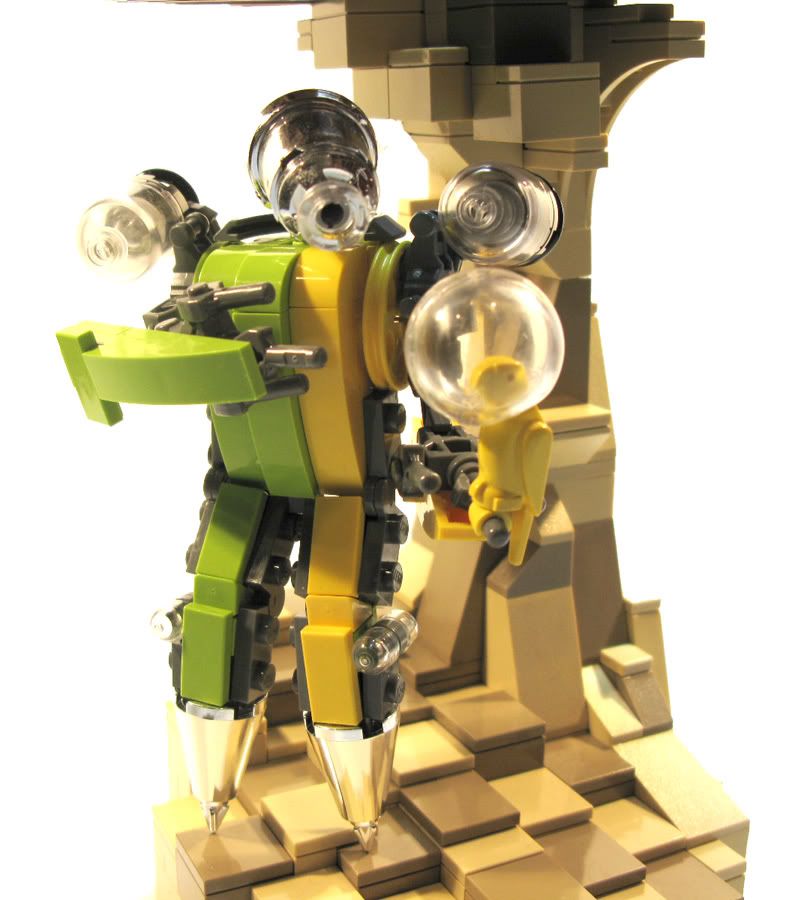 SirNadroj Posted May 19, 2009 Posted May 19, 2009 Let me start by saying this is not a Power Miners MOC. I just has a lot of lime hanging around, is all! It started with the birch tree.... not sure how it morphed, but things happen. This is an entry for MECHA Hub's Civilian Mecha contest over at their group on flickr. "The Geo-Bot 8.9 mines in an underground cavern, which resembles Giant's Causeway. Equipped with heavy armor and drill feet, the Geo-Bot 8.9 can grind up an obtrustive rock formation in its path. Also, it finds companionship in a canary - the mecha's programmers are unsure of the cause of its affection for the avian creature, as robots do not feel. Leading researchers call this phenomenon "heartbyte". Apparently the glitch bites the "heart" - that is, the central memory chip of the metal man. However, the glitch does not affect the mecha's occupation - mining - so he has yet to be thrown into the trash compactor." http://i181.photobucket.com/albums/x222/sirnadroj/1-152.jpg http://i181.photobucket.com/albums/x222/sirnadroj/2-136.jpg http://i181.photobucket.com/albums/x222/sirnadroj/3-129.jpg http://i181.photobucket.com/albums/x222/sirnadroj/7-47.jpg Thanks. Quote