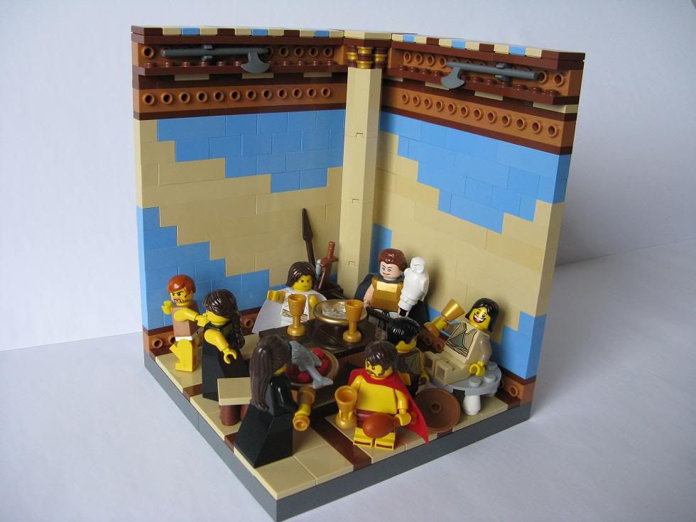 MagPiesRUs Posted September 30, 2010 Posted September 30, 2010 (edited) I've just been reading Homer's The Odyssey, and with the release of the Spartan minifig I thought it was the perfect time to make a few vignettes based on the story. This one's from Book 1: Athene visits Telemachus: Telemachus led Pallas Athena into his home. She followed. Once they'd come inside the high-roofed house, he walked to a tall pillar carrying the spear and set it in a finely-polished rack, which held many other spears belonging to Odysseus. He brought Athena in and sat her in a chair, a beautifully crafted work. Under it a foot stool for her feet. Beside her he drew up a lovely decorated chair for him to sit in. They were some distance from the other people, in case the noise the suitors made disturbed the guest and made him hate the meal because he'd had to share the company of overbearing men. Then, too, Telemachus wanted to discuss his absent father. A female servant carried in a fine gold jug and poured water out into a silver basin, so they could wash their hands. Beside them she set down a polished table. Then the worthy housekeeper brought in the bread and set it down before them. Next, she laid out a wide variety of food, drawing freely on supplies she had in store. A carver sliced up many different cuts of meat and served them. He set out goblets made of gold, as a herald went back and forth pouring their wine.Then, one after another, the proud suitors came. They sat down on reclining seats and high-backed chairs. Heralds poured water out for them to wash their hands, and women servants piled some baskets full of bread, while young lads filled their bowls up to the brim with drink. The suitors reached out with their hands to grab the tasty food prepared and placed in front of them. When each and every man had satisfied his need for food and drink, their hearts craved something more— dancing and song—the finest joys of dinner feasts. A herald gave a splendid lyre to Phemius, so he was forced to sing in front of all the suitors. On the strings he plucked the prelude to a lovely song. But then Telemachus, leaning his head over close to Athena, so no one else could listen, murmured to her: "Dear stranger, my guest, if I tell you something, will I upset you? These men here, they spend all their time like this, with songs and music—it's so easy for them, because they gorge themselves on what belongs to someone else, and with impunity, a man whose white bones now may well be lying on the mainland somewhere, rotting in the rain, or in the sea, being tossed around by waves. If they saw him return to Ithaca, they'd all be praying they had swifter feet rather than more wealth in gold or clothes. But by now some evil fate has killed him, and for us there is no consolation, not even if some earth-bound mortal man should say that he will come. The day has passed when he might have reached home. Odysseus has been lost at sea for many years, and now suitors live at his palace in Ithaka, hoping to marry his wife Penelope. Athene comes to Ithaka to reassure Odysseus' son Telemachus. She tells him to sail to Pylos and Sparta, in the hope they may have news regarding Odysseus. Without minifigs: It's getting dark here now, so I'll post some more pictures later. In the meantime, comments and feedback are appreciated. Edited November 29, 2010 by I Scream Clone Quote