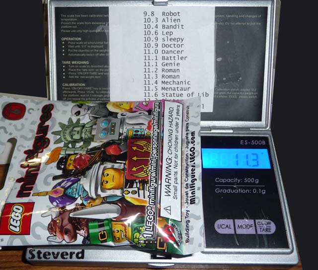Steverd Posted January 29, 2012 Posted January 29, 2012 OK, it's not a secret, but here's my finding on Minifigure series 6. This may be controversial for some, but here's how to get the series 6 figures you want and get them fast. Much faster than the feel method. I went through NINE full boxes in less than 30 minutes. Use a Digital Pocket Scale, and weight them. Yes, I know this is NOT NEW. Tape the list on your scale (see image) Here the weights in grams. 9.8 Robot 10.3 Alien 10.4 Bandit 10.6 Lep 10.9 Sleepy 10.9 Doctor 11.0 Dancer 11.1 Battler 11.1 Genie 11.2 (could be Genie or Roman) 11.3 Roman 11.4 Mechanic (Some Mechanics are 11.3) 11.5 Minotaur 11.6 Statue of Lib 12.2 Skater girl 12.3 Galactic girl Be real careful with the 11.3, if could be a Roman or it could be the Mechanic. You will have to feel the 11.3 packets. Quote