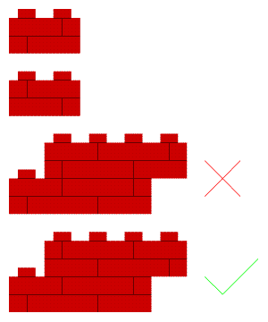 David Thomsen Posted September 16, 2011 Posted September 16, 2011 I just think its a lost opportunity not to put a different pattern on the opposite side, just like the grille bricks. Two for the price of one, what's not to love? I suspect the brick needs to have a mirror pattern on the reverse side, like this: That way you can make a proper brick wall with interlocking bricks. If all of these bricks have an identical pattern on both sides, interlocking walls will end up looking like the one I've marked with an 'x'. Quote
