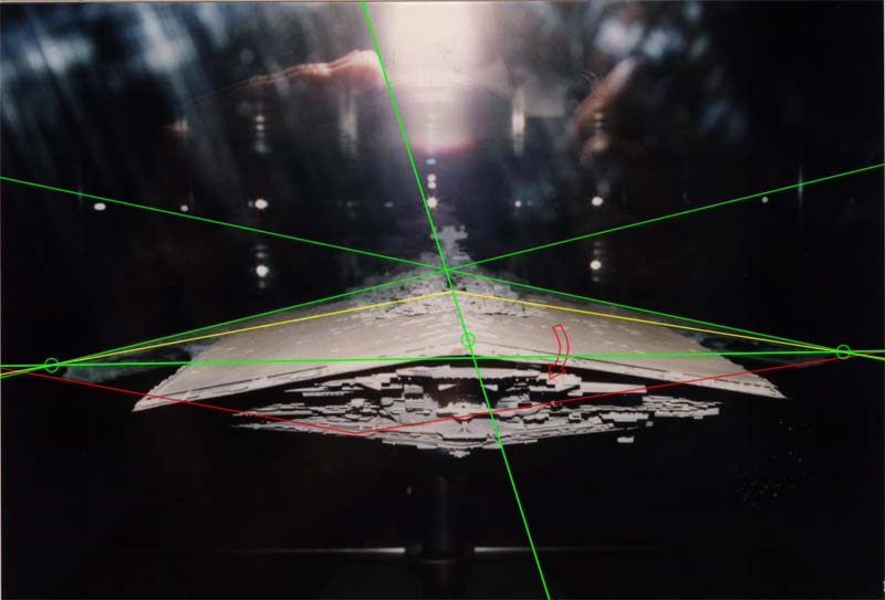 Aeroeza Posted January 29, 2012 Posted January 29, 2012 (edited) Alrighty! I'm having fun with angles! I'm also wanting to check myself and avoid making horrible assumptions when it comes to the lower hull of the SSD so please bare with me folks! It's obviously next to impossible to be certain about anything but if ever I'm gonna MOD this 10221 monster then I'd like to be as sure as my meager expertise allows... Just to clarify the image below consists of several profiles of the SSD, one being a stitched together, vaguely side on angle of the original model. This first profile was constructed from photos downloaded from Curtis Saxton's Technical Commentaries. I've used the cityscape profile as reference points for aligning the separate images and as you can see the photographer did a good job for about two thirds of the model. Despite its visual limitations when sitting side-by-side with the second profile (snatched from the spectacular work of Jeff Russell) they support each other rather well. Differences in the hull heights in the two profiles could be attributed to lens distortion phenomena inherent in any photo and the fact that the second profile is a blueprint a.k.a. an orthographic image lacking depth characteristics. Russell's work I suspect was based on Anthony Tully's and Martyn Griffiths' drafting. In addition he probably also would have had access to model shots like these broadsides. The final profile is of course the promotional photo (basically side on) of 10221 in all its controversial glory. Anio has kindly highlighted some key discussion points in red and green. The most illustrative appears to be the red line on Russell's profile verses 10221s. Clearly the centreline of the Lego model is too low given the position of the middle engines and the fact that the forward engines are obstructed from view. However, Mortesv has correctly surmised that this image was "taken at an elevated angle - further accentuating the 'top angle issue'". Inspection of the physical model shows the A-Frame or centre line is actually level with its middle engine housing despite what the photo indicates. After building 10221 myself and studying it's characteristics I feel the set's designer prioritized the Executor's needle-like profile but was hampered by having to also install a minifig bridge. This caused a few problems for the accuracy sticklers... The A-Frame is actually well positioned, however the minifig bridge has added height to the model (about a brick's worth). The floor of it is level with the plate located just under the A-Frame so it takes up a lot of room (it's approx 14 studs wide & six studs high)! This has increased the angle of the top hull plating making it much steeper than the reference material suggests it should be. It also means the volume of the bridge's 'real estate' gets in the way of an angled lower hull which simultaneously; a. mirrors the upper hull b. maintains the needle-like profile. In order to keep the profile slender the solution was to make the bottom flat. Sure you could mirror the present upper hull angle on the underside and keep the compartment but it would be a pretty fat and 'unUCS-like' profile! ...and this is why many UCS enthusiasts get annoyed with play features- they compromise builds!!! It's been suggested that George Lucas himself asked for the bridge as a late modification- mind you everyone thinks he shot JFK from the grassy knoll so who knows. Poor guy always gets a bad wrap... The final design does add strength to the model- it sure as hell is extremely sturdy, and everything connects beautifully. There are no magnet issues or bendy noses (like with 10030)! Arguably, if there had been no bridge and an angled lower hull was added in keeping with a low profile and two support struts on the frame, then the nose would never have bent over time anyway . Anio's SSD MOC suggests this although of course these two models are beasts running in different races and direct comparisons could be misleading... Mortesv has put forward the following solution for a more accurate build... "the (preliminary) conclusion would be that further modification does not necessarily entail moving the A frame up - but instead lowering the entire city super structure." This would certainly create a more pleasing angle for the upper hull. I'd also suggest removing the bridge compartment altogether to create the opportunity for designing a studs down lower hull more in keeping with the much valued slim profile... This brings me to my final musings- does the angle on the top of the hull match the bottom?? I genuinely would like to be sure! I've had a quiet weekend so couldn't help but be geeky and industrious when it comes to the problem so here we go... 1. The green circles represent my starting point where I've worked out the camera persons 'angle-of-attack' so-to-speak. 2. Using these reference points and the lines of the hull I've determined where the nose of the model is relative to the camera as well as its central line of axis. 3. Again using the green circles and the clear lines of the hull fairings around the mid-engine housings I've drawn two yellow lines which happily cross exactly with the green central axis. This gives us the upper angle of the hull which can be measured using the (almost) horizontal green line which crosses through the two green circles of the 'wingtips' (the ships horizontal or X-axis relative to the camera). I've lost my protractor so if someone would be so kind... 4.I've then flipped the upper hull's yellow line along the image's horizontal plane (see arrow) and changed its colour to red for clarity. Finally I've lowered it slightly along the vertical until... Bingo!!! Note: the X-axis of the SSD here (green line) is a tiny bit different to the photos horizontal alignment. My image editing software used the images horizontal plane instead and I didn't worry about adjusting for this small inaccuracy. As you can see the photographer did a prett