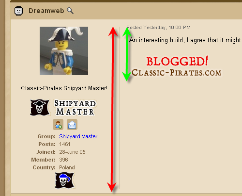 Strikeman Posted February 6, 2012 Posted February 6, 2012 (edited) Hmm... it's strange indeed. I can see a large blank space below your blogged image, but it doesn't seem possible to delete it. Well, never mind in that case. It isn't that strange Admiral Croissant, I think the arrows are self-explanatory. The post itself is only as long as the green arrow, but Dreamwebs avatar, title, information and extra flags take up the space of the red arrow. Therefor, if Dreamweb makes a post that is less long than the red arrow, there will always be a bunch of whitespace at the end of his posts. Also, on-topic: this is a pretty MOC, I like the fact that it isn't a studless build actually. Not to say that studless builds are not cool, it just has a more LEGO feel to it when I can actually see the studs Edited February 6, 2012 by Strikeman Quote