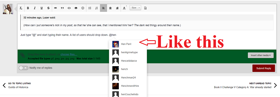 Henjin_Quilones Posted January 11, 2017 Posted January 11, 2017 32 minutes ago, Lazer said: (How can i put someone's nick in my post, so that he/ she can see, that i mentioned him/ her? The dark red thingy around their name.) Just type "@" and start typing their name. A list of users should drop down. It should look like this: Quote