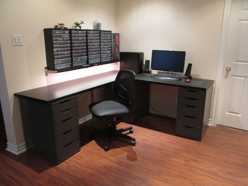 BusterHaus Posted August 14, 2015 Posted August 14, 2015 In mid-2015 I set up a dedicated space for building. I picked up a couple of desks and a shelf at Ikea and made an L-Shaped desk out of them. Under the shelf is an LED strip that illuminates the otherwise dark area. I got a model that has an adjustable brightness and multiple colours. The drawers hold more parts in screw organizer boxes: I also installed some cable routing channels. It's a very inexpensive way to hide the usually-dangling cables. Finally, I used some double-sided tape to attach a power bar under the surface of the desk. It makes cleaning there much easier. The same tape was used to attach the control box for the LED light. Quote