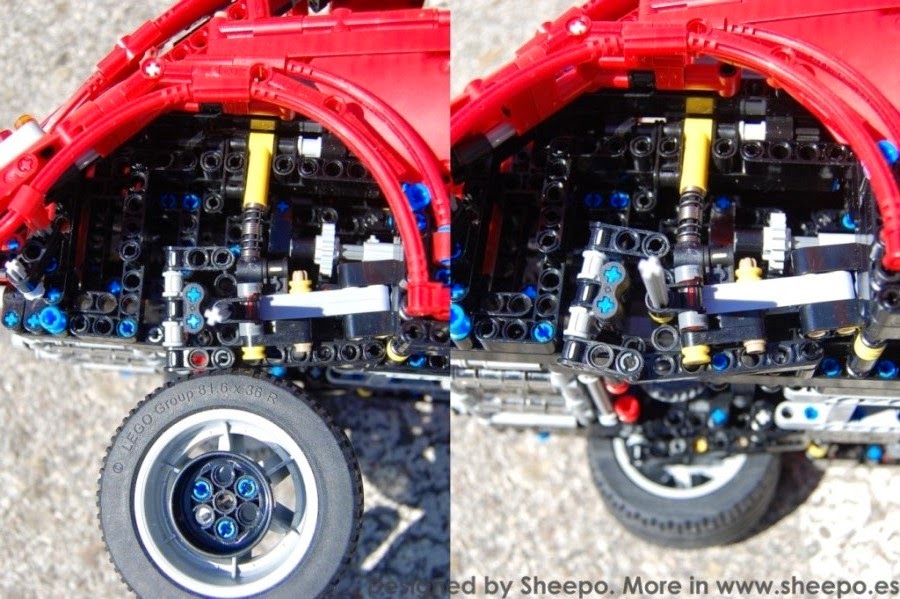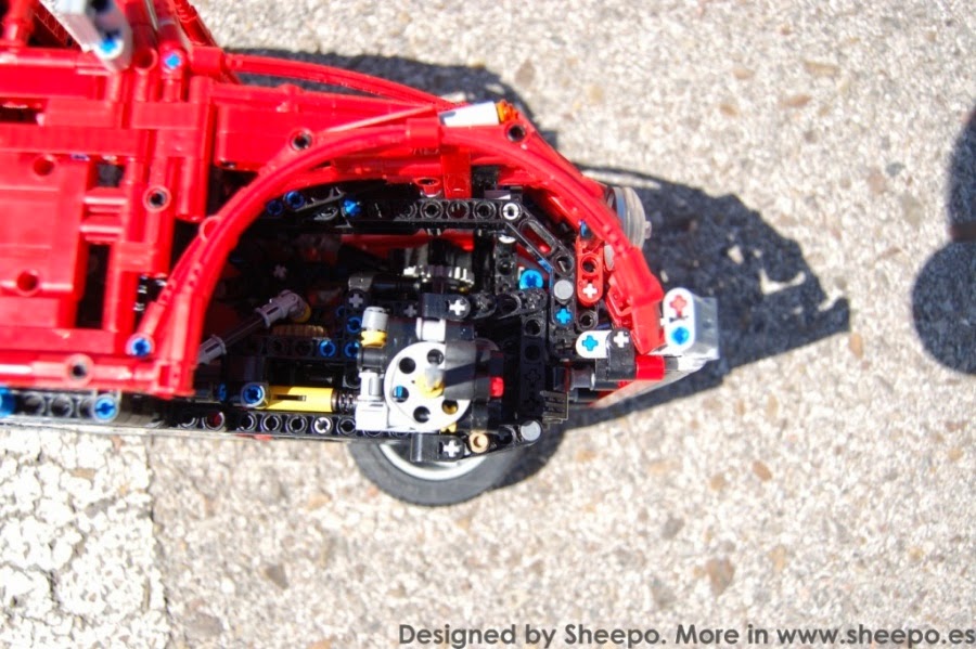 Sheepo Posted May 25, 2014 Posted May 25, 2014 (edited) Here is my lastest car. The classic Volkswagen Beetle, officialy called Type 1, or informally in some places around the world the VW Bug. This car received a lot of modifcations and improvements along the years, I have built the 1967 model. This car is made in scale 1:7.8. The total size is: 65 studs of length, only 25 wide and 23 of high (50x20x18 cm) The weight is 2.5 kgs, with around 3000 parts and 5 motors. As always it includes some remote controlled functions: - Steering (M motor) - Drive (2 XL motors) - Sequential gearbox (PF Servo motor) - Brakes (M motor) The sequential gearbox is a modified version of the Mustang's gearbox (3rd Gen V2), with 4+N+R speeds and as always with auto-clutch. The speeds ratio: R - 1.25:1 1 - 1.25:1 2 - 1:1 3 - 1:1.33 4 - 1:1.67 The max speed in 4th speed is 4 kph (~2.5 mph) It has a gear indicator in the interior, between the front seats. Boxer-4 fake engine under the rear bonnet. The bodywork Also you can disassembly the bodywork removing only 5 pins, do it is very easy and fast. A complete bodywork with openable doors, front trunk bonnet and and rear engine door. Also the doors have lock, you need turn the door handle to open it. It has 4 full size seats and folding front seats. The suspension is based in the real one: front rigid beam independent suspension axle and rear swing axle. Also the front axle has stabilizer bar. The steering has ackerman geometry and working steering wheel. The car also has working brakes in all wheels: disc brakes in the fron and drum brakes in the rear. In addition it includes functional brake pedal. Now the "most wanted" picture for technic fans. Like the Mustang the instructions will be available coming soon Finally as always a little video: As always for more info visit my website: sheepo.es Edited May 25, 2014 by Sheepo Quote