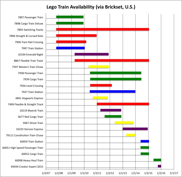 MojoLego Posted January 21, 2015 Posted January 21, 2015 For grins, here's a product release chart for trains. I've included the two rumored 2015 trains. Green: City Trains Red: Track Blue: Structures Purple: Creator Expert Yellow: Theme/Specialty