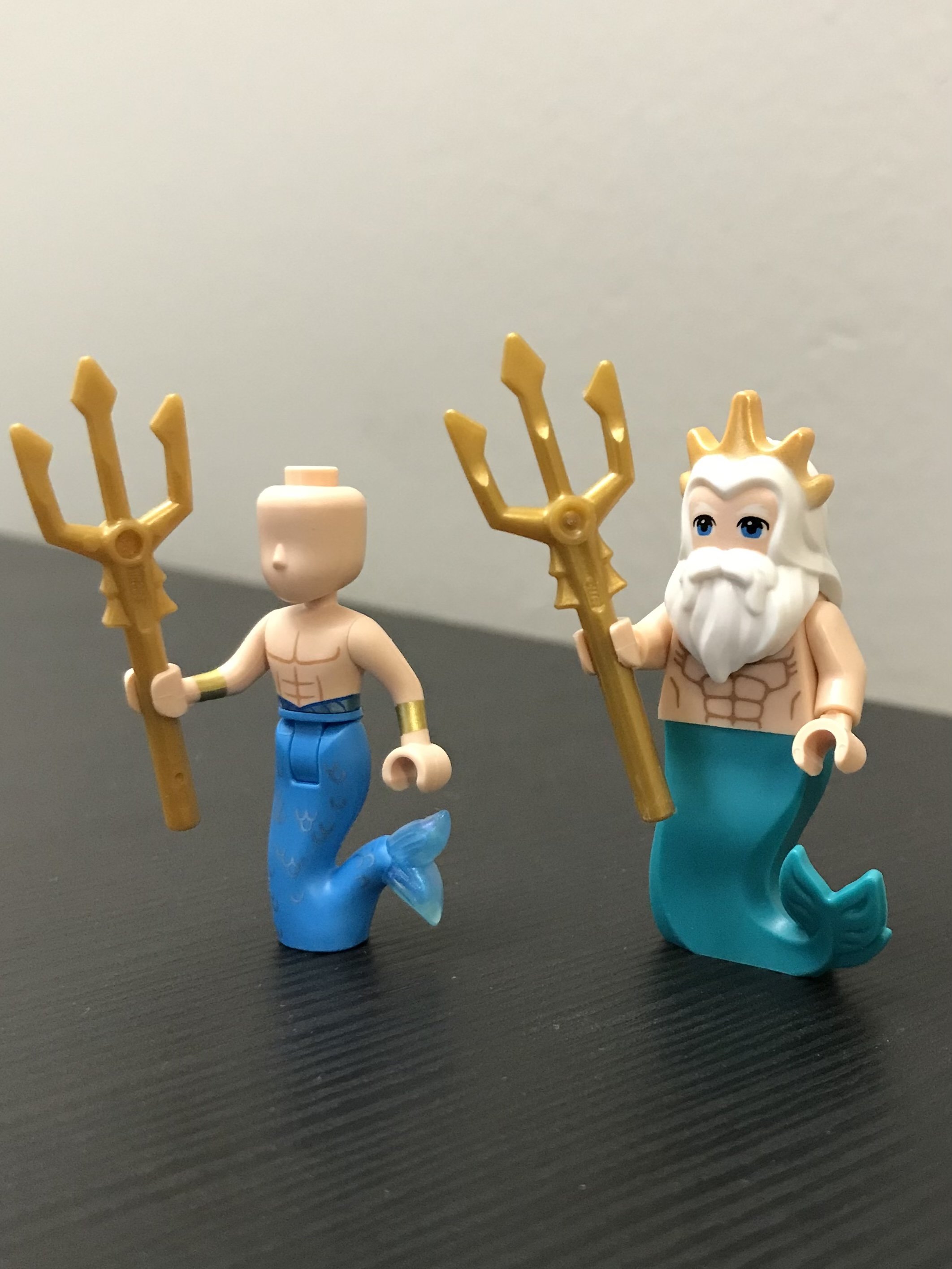 @Surge Here ya go: I think it kinda works. If there were ever an occasion for Lego release a minifigure version of Triton, I think reusing this piece with more appropriate printing would work very well. I’m not sure if it has been mentioned anywhere, but all three of the mermaids from the set have newly designed tails, with fins that are duel molded with transparent opalescent colors—which look really nice. -