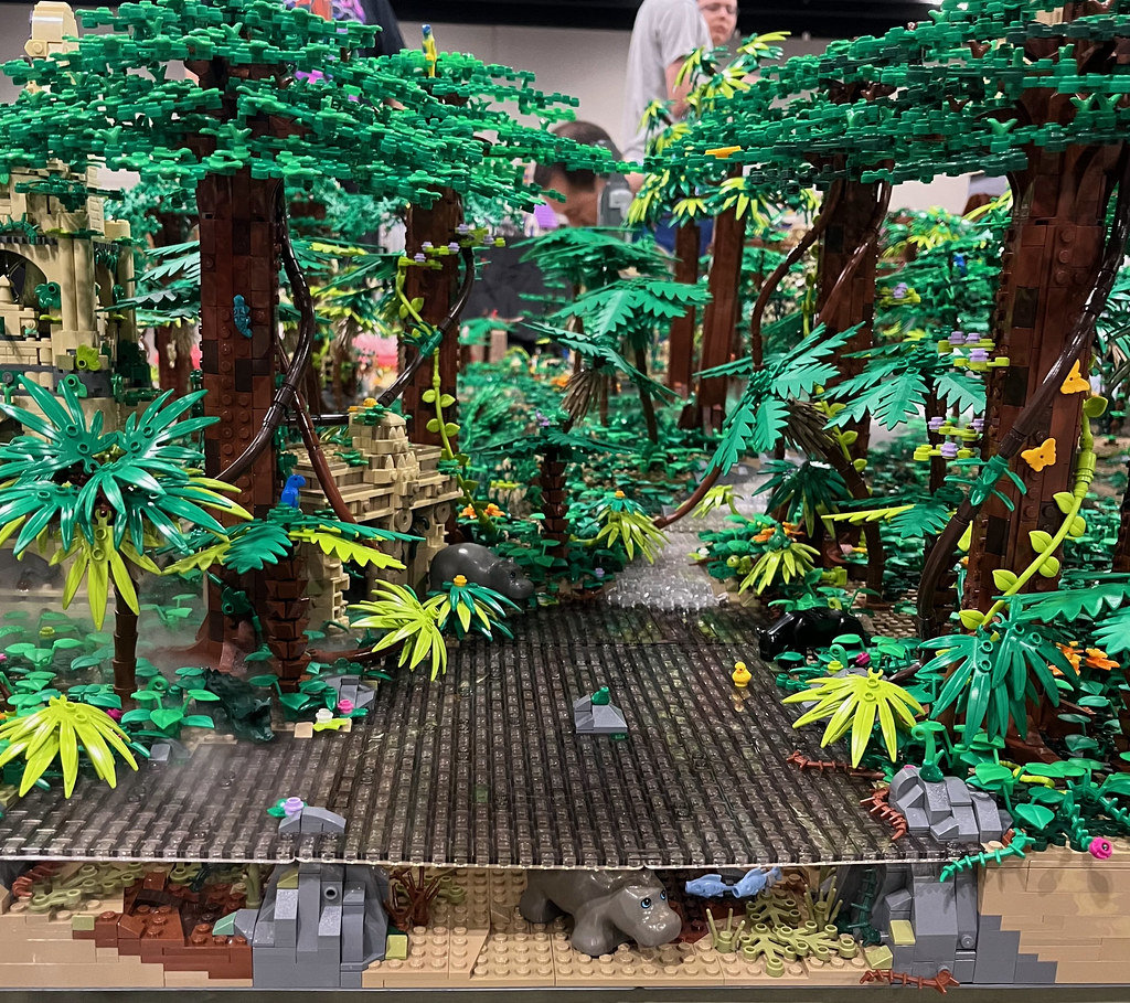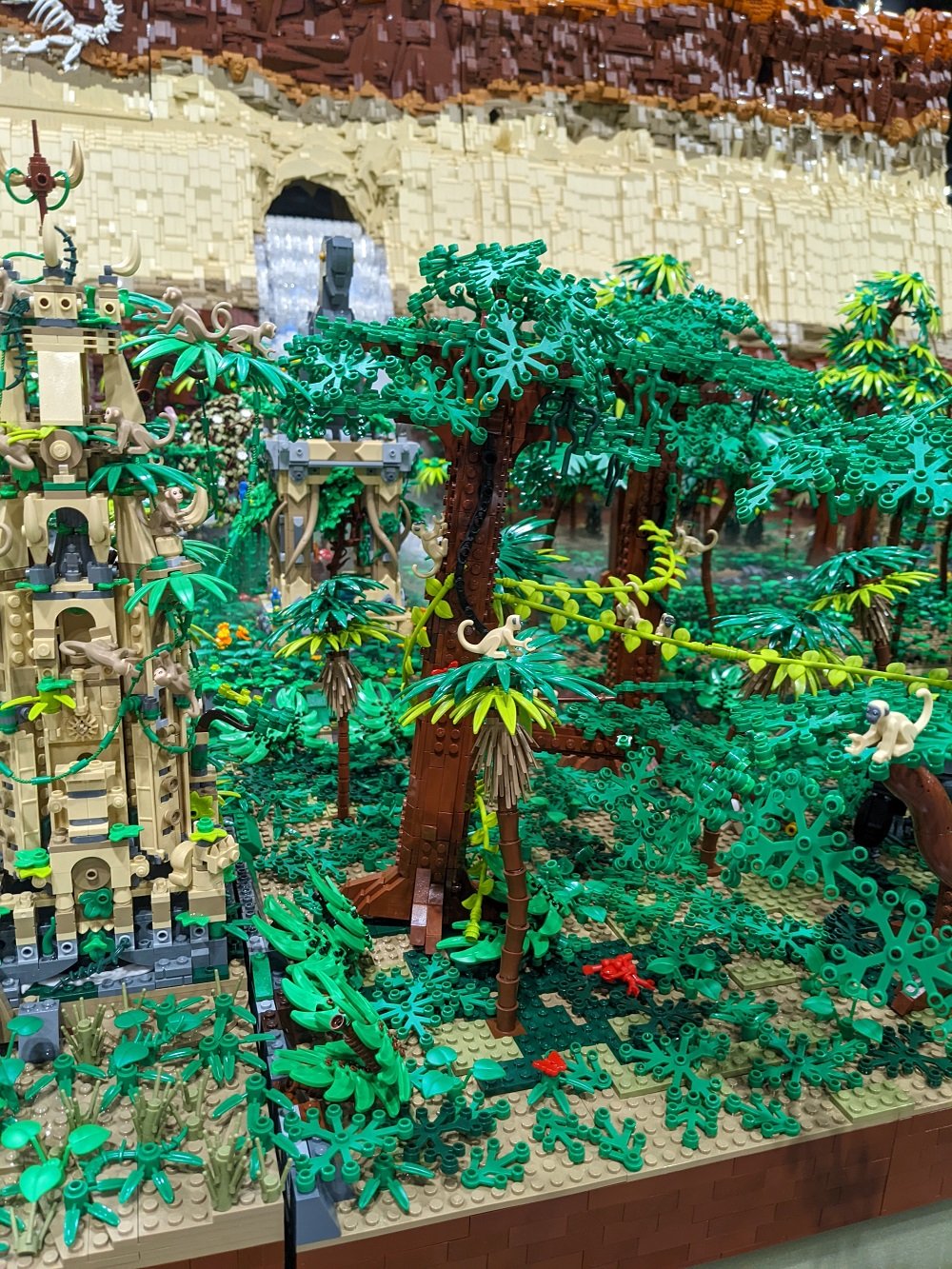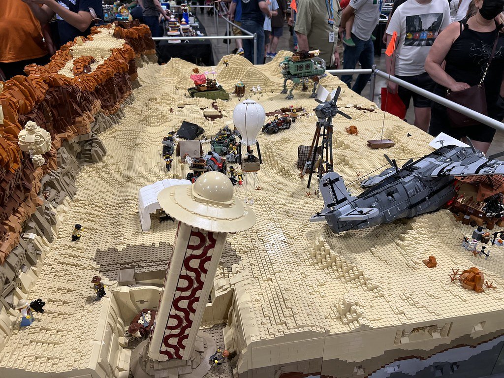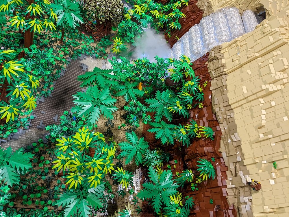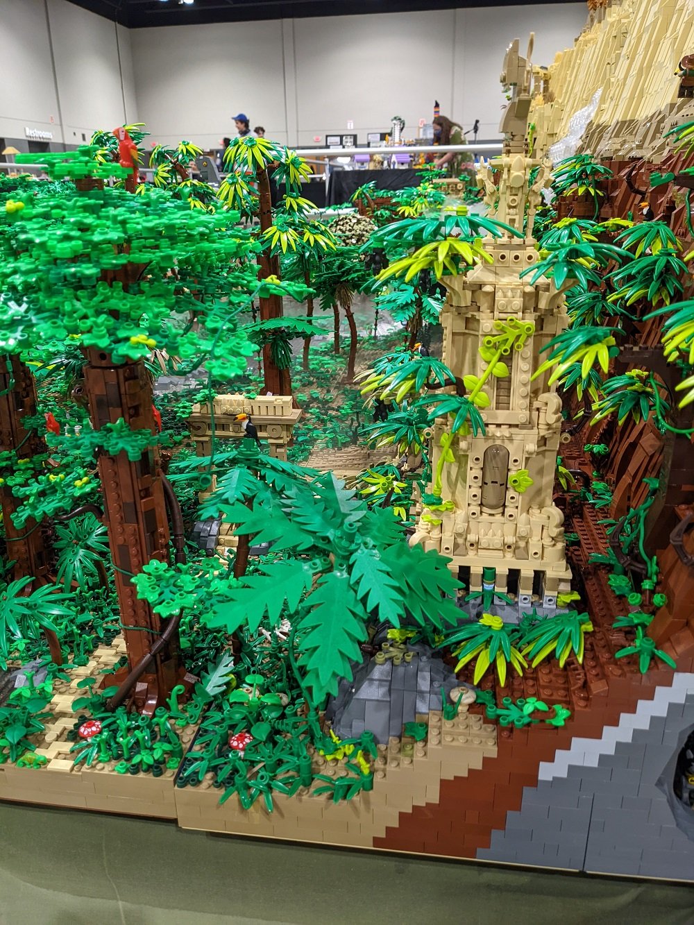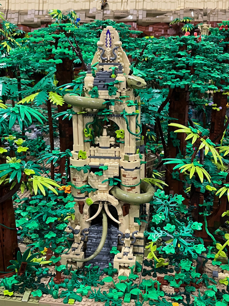 The Oasis Each year, a dedicated group of Eurobricks members assemble in Schaumburg, Illinois, at the annual Lego convention--Brickworld Chicago--to construct one large and crazy collaborative display. This was the result: The Eurobricks collaborative display for Brickworld Chicago 2022 was the Oasis. A sprawling adventure across deserts and jungles, the Oasis display attempted to replicate that exciting feeling of discovery. Utilizing sightlines and some clever (if perhaps intense) planning, the harsh desert and lush jungle were hidden not only from each other, but from the viewer too. Upon approaching the display, the viewer was greeted only by the endless desert and the tenacious adventurers traversing it. But like the adventures, as the viewer explored further and walked around the display, a massive jungle would appear and a new epic would begin. And just as the explorers would ask themselves upon seeing the ruined temples of the jungle, you too are probably pondering, who built this?! Well Eurobricks that's who! From Jungle to Desert: @Darkdragon @Cecilie @KotZ @Quarryman @Hinckley @RoxYourBlox @Kristel @MKJoshA @ZCerberus @Rogue Angel @Cheesey @Silver.Smith @Captain Nemo @Peppermint_M @Evensong Not Pictured: @Ryushi @Prune Face @Vincent Kessels The Oasis was built by 18 Eurobricks members over the course of three years! Yes, read that right, three years! Our dedicated Eurobricks collab family has been working on this display since Brickworld Chicago 2019 and one short apocalypse later, we were finally able to come together at Brickworld 2020 2021 2022 to display it as we always intended. Spread across four tables, spanning 10 feet by 8 feet, with a height difference/drop of around 4 feet, this was our most ambitious and intensive display yet. Utilizing hundreds of thousands of pieces and just as much blood, sweat, and excess jungle water, this display was finally assembled together at Brickworld after a three day setup process. After which it was promptly destroyed. The Desert While the display itself is massive, the entire collaboration is comprised of smaller segments built by all of our teammates. Just like the spectators would see in person, let's start with a closer look at the Desert side: While on paper a desert might seem like a bit of a bland build concept, in reality it is anything but! Covering 8x5 feet, this desert features massive dunes, insurmountable cliffs, downed planes, and even a mobile tavern. Also, this was built with all of the tan plates in the world. With such a large barren landscape, what's the best way to cross it? A plane of course! Built by @Silver.Smith & @Evensong (Phil & Maria), this downed cargo plane now acts as a makeshift home for explorers. Deceptively massive, this wreckage now features a campsite, a shanty shack of fabric pieces, and even a functioning windmill created with one of the plane's propellers. Phil & Maria also built sections of the jungle that we will see later, but their plane was nominated for Best Airship. Additionally they received nominations for Best Small Group Display, Best Group Train, Best Land Vehicle, and Best Mecha In addition to building the downed plane, Phil & Maria built the desert section below it--which included a previously hidden cave filled with crystal blue water. This area is now being explored with some most-likely-not-up-to-code wooden walkways. A plane is a more traditional way to travel, but if you have the money and want something with style, perhaps try this steampunk walker built by @Quarryman / Jens. Utilizing some nice large transparent domes and lax child labor laws, this Wild Wild West styled walker makes exploration a breeze. This build was nominated for Best Mecha. If you don't mind the heat or slumming it with plebs, you could also try the cheaper option of an old tank turned tavern turned bathhouse? Whatever this is, Jens' equally impressive tank certainly added some stylish (hats) flair to the desert. That tank is all the more impressive when you realize it traversed the massive dunes built by @RoxYourBlox / Pete. Elsewhere at Chicago, Pete's builds won Best Mechanical, Best Humor, Best Group Display, and was nominated for Best Creature and Best Large Building. While dunes are difficult to cross (and even more annoying to build!) having to watch out for holes that fall into a river is also a bit of a challenge. Built by @Captain Nemo / Tim, the cracked earth on the desert side shows hints of the adventure to come. Beneath the earth is a five foot long, partially mechanized, underground river that flows from the edge of the desert through to the jungle and beyond. The desert holds more secrets than a river though, as adventurers are uncovering hidden temples by the base of the cliffs. Built by @MKJoshA / Josh, this expedition force is digging out a large tower, which features a hidden chamber beneath the ground. Desert vehicles were created by @Peppermint_M / Christie, who also built an Ice Cream Shoppe for the Eurobricks Gingerbread train layout, which was nominated for Best Train Layout. Below you can see various hidden details such as geodes, dragon skulls and skeletons embedded into the cliffs and ground, all built by Josh. And of course we need to talk about the cliff work, which is rather difficult to breakdown into segments, as they miraculously lined up rather well on site! The desert cliffs (both the desert facing side, and their jungle facing backside) were built by (from plane/left to dune/right) Josh, @Rogue Angel / Kevin, Tim, and @Cheesey / Caleb. In large part the quality of the cliffs is due to Caleb, as he first constructed his cliff sections in 2019, and created the style template that the rest of us matched. Caleb also built a segment for the jungle and numerous other builds for Chicago, taking home the win for Best Small Building, Best Group Layout, Best Dirty Buildster, and the nomination for Best Medieval. Caleb also created a spectacular video detailing this collaborati
