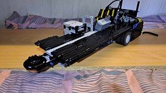 New update. Bottom sides are now complete and according to studio.io, this project has almost 2200 parts (and articulated section is not even finished). In the future, part colors and some elements are about to change. Current dimensions - Width: 25,1 studs/20.1 cm (I tried to make it thinner by two studs but double wheels makes it impossible), Length: 74.3 studs/59,4cm; height is 18.1 studs/14.5 cm. Weight is almost 2 kilograms. -