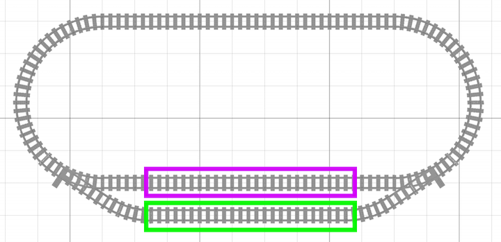 1. I have a 9v train layout similar to this. I have two trains, one train parked in the green box and one train in the purple box. I am trying just run one train at a time by using the switch tracks to only allow the electrical current to go through the aligned track. Any ideas on how to do this? I have tried to take apart a switch, but couldn't quite figure it out.