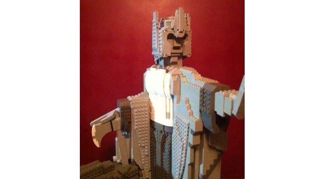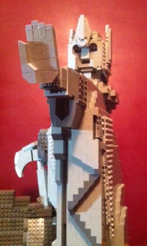 12. This is my first draft of one of the two statues that form the Argonath from the Lord of the Rings. The figure stands about 24 inches / 61 cm tall and consists of about 5000 bricks. A standard mini-figure stands about as tall as the thickness of the foot which makes the scale of the statue a little less than half the size of the one in Peter Jackson's film, but certainly big enough to qualify for building on a Numenorean scale. I don't particularly care for the use of white bricks in the figure. It was an act of desperation as my supply of light grey was running very low (I have more on order and will be rebuilding the breastplate and axe head as soon as they arrive). I haven't decided about the use of dark gray in the main figurine. The purist in me wants it to be all light gray since its a weathered statue made from a single type of stone; but I also think the touches of dark gray add some character. I welcome opinions on the matter. Additional images of the statue can be found over at my Cuusoo account (search for Argonath, it's hard to miss a giant statue) I'm currently working on the design for the companion statue but that may take a while...