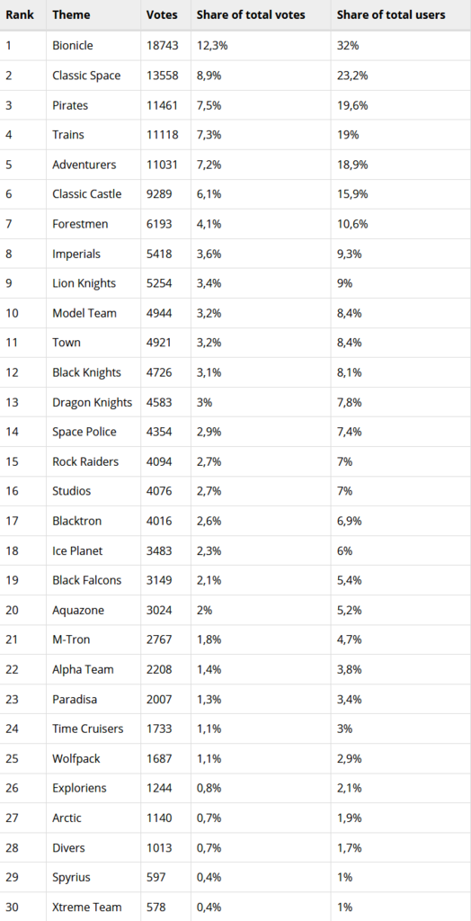 18. Upon counting I noticed there 7 Space and Castle sub-themes, 2 Pirate sub-themes and the rest had one sub-theme. Unless you count Paradisa as a Town sub-theme, then town also has two sub-themes in this poll.