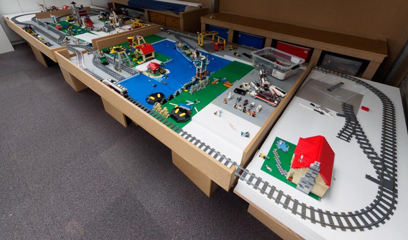 Thanks. Yes the kids made a mess of it, but I only see them every few years so I wasn't too worried. And the trains need a run - that's why I built a layout. The lego is on polystyrene on MDF. You can't tell from this photo, as I have it set down at a lower level so the kids could reach it, but it usually sits up on the table in the background, and when I remove the taller buildings it can all fold up flat against the wall if required. Most of the time I just stack one 1/2 on another, which saves space, but still lets me get access.