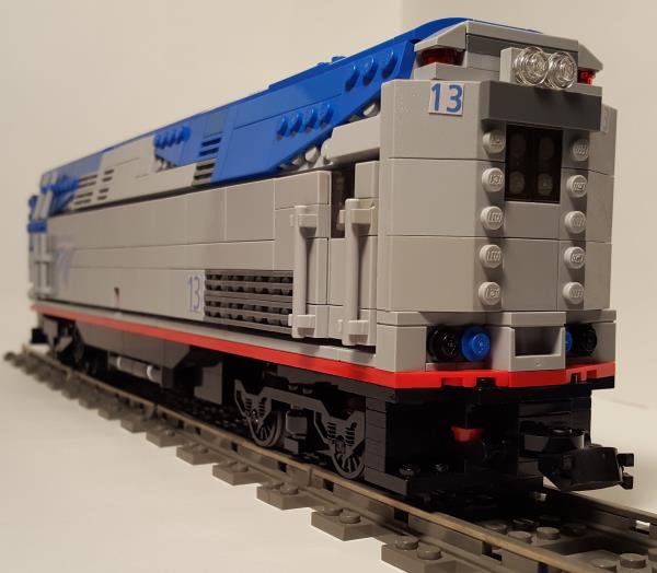 Hi all, I'm new to this forum, but I've been building LEGOs for quite a few years. I was surprised upon doing some Googling at how few LEGO models of the P42 have been made, since while it usually isn't well known for it's attractive looks, it is the most commonly used passenger locomotive used in the United States. Since I'm one of the weird ones that actually likes both the look of the Genesis and the Phase V paint scheme, I decided to try my hand at recreating it. It's built to 8 studs wide, though admittedly I sacrificed the scale a bit to make the locomotive taller so as to add more details. Overall, I think I got pretty close to capturing the 'feel' of the real thing. The model is basically hollow inside, and is built to use a battery pack, receiver, and PF motor (note the square-shaped hole on the roof, where the on/off switch would be if the battery pack was installed. Let me know what you think! Link to full-sized images (and more pictures): https://flic.kr/s/aHsm5yC5kC